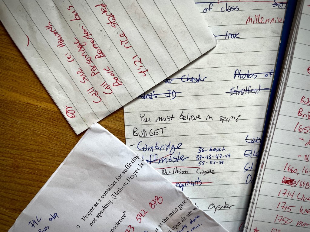 A few weeks ago, when the semester fell into full swing, I found my desk covered with books and notes-to-self scrawled in various places on bits of paper. That’s actually how I like things—I prefer to nest in at least a little bit of clutter—but at one point I became overwhelmed. There’s no snow here in Britain, but I had that grim, resigned feeling I would have felt back in Michigan marching out to shovel the sidewalk while more snow is falling, just to keep up.