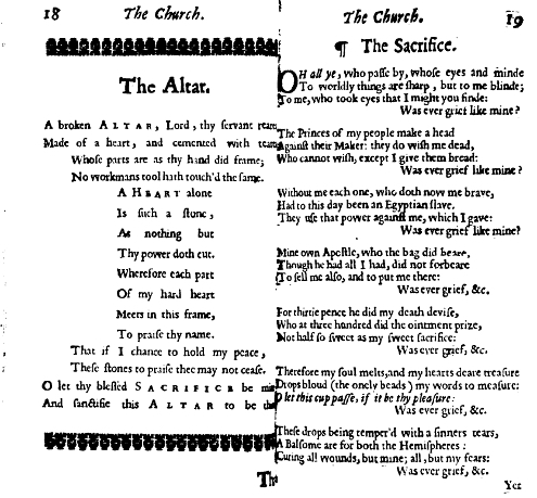 “The Altar” is the first poem in “The Church,” the main collection of Herbert’s poetry. (I wrote a few weeks ago about this placement.) The very next poem, “The Sacrifice” picks up on this equivocal ethos. It is written in the first person (the “I” to which we’ve just been introduced), but the first person is not the poet: it’s Jesus as he is betrayed and crucified.