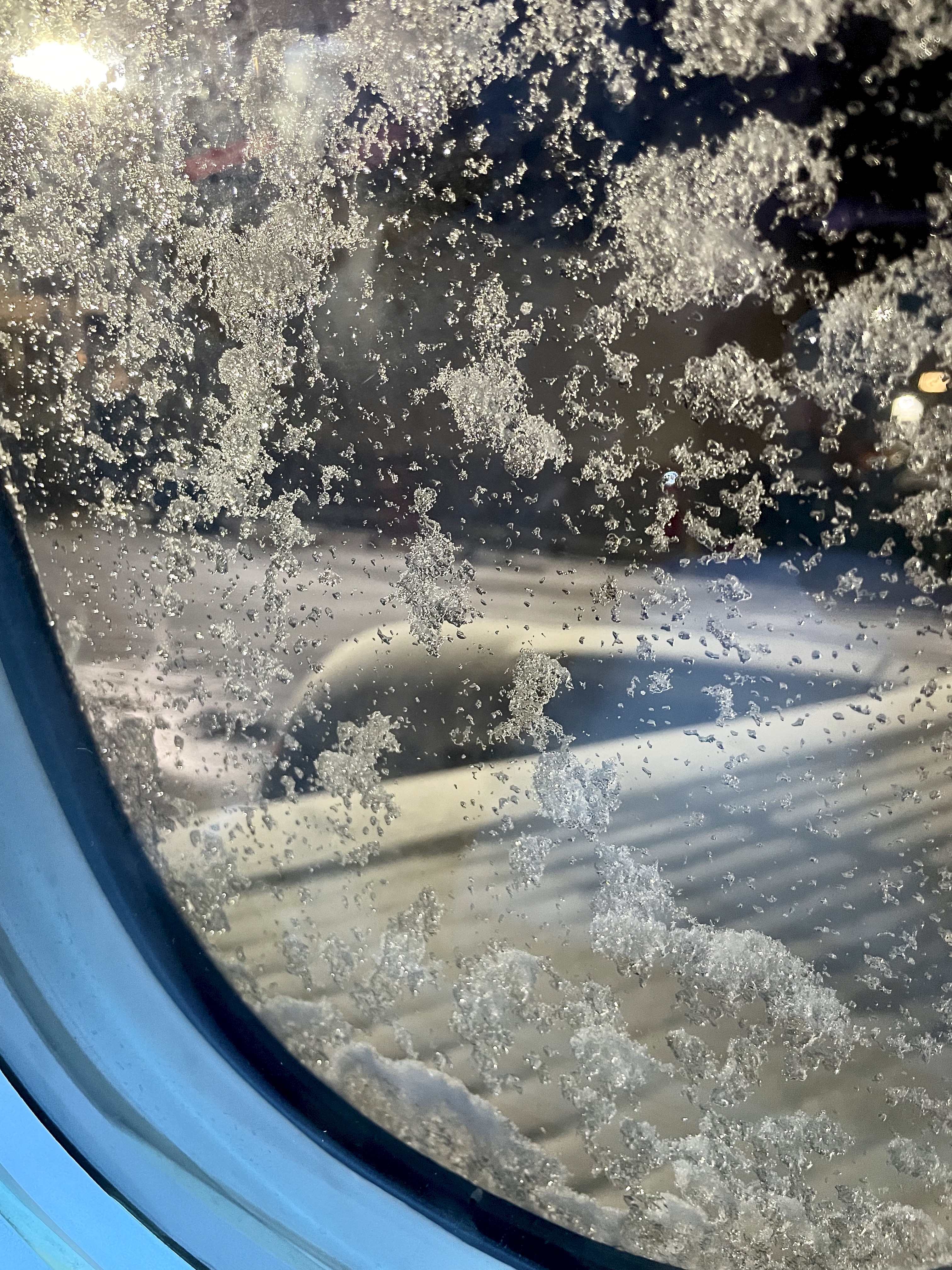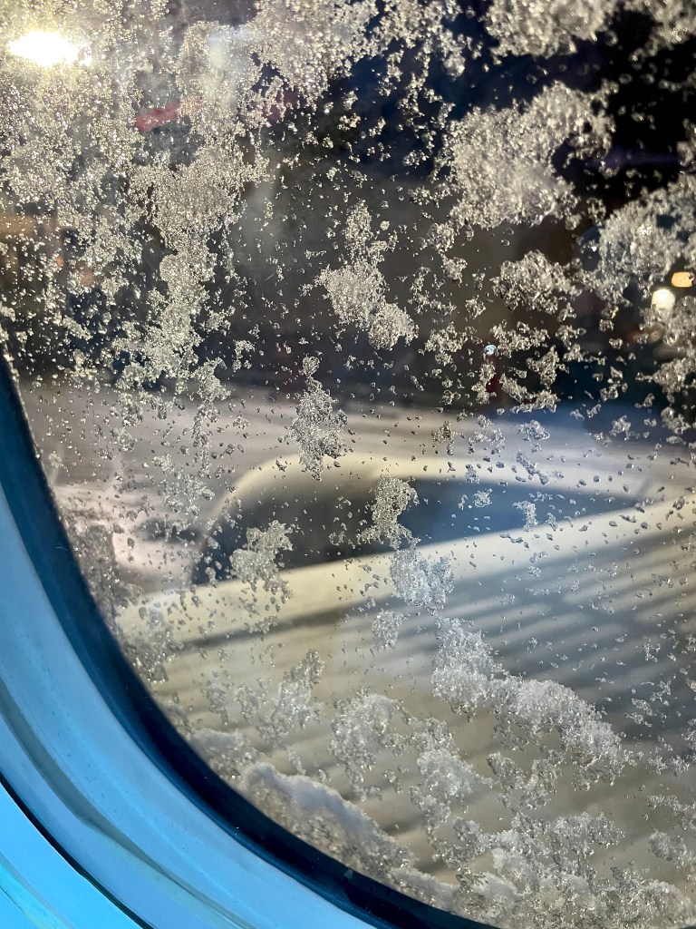 The ice and snow had just been closing in on the airport as we fastened our seatbelts pulled back from the gate. For some reason, I took a picture. Several hours later, I looked out the same window just as the pilot announced our descent into London. And I took another picture.