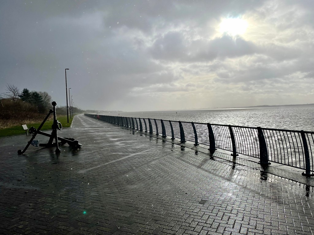 A couple of weeks ago, I took a run through suburban Liverpool. It was mild and cloudy when I left home. By the time I got down to the River Mersey, the wind was fierce, and it was hailing. Also, the sun was shining through the clouds. I took this picture: