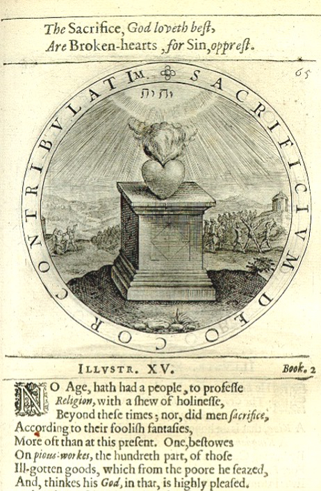 We’ll get to the psychological dimension in a moment, but it’s also worth noting that Herbert’s presentation of the altar itself was witty and innovative for his day. He seems to have had in mind emblem books, which were quite popular in the early seventeenth century. An early modern emblem has a title, a picture, a motto, and a poem—all of which work together to teach a moral lesson. Several emblems featured a heart on an altar: